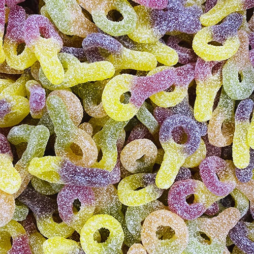 Ingrédients : Sucre, sirop de glucose, amidon modifié, eau, gélatine, acidifiants (acide lactique, acide maolique, acoide citrique), correcteur d'acidité (malate de sodium), arômes, denrées alimentaires colorantes (concentré de spiruline, carthame, raisin, jus de carotte noire), colorants (curcumine, extrait de paprika)